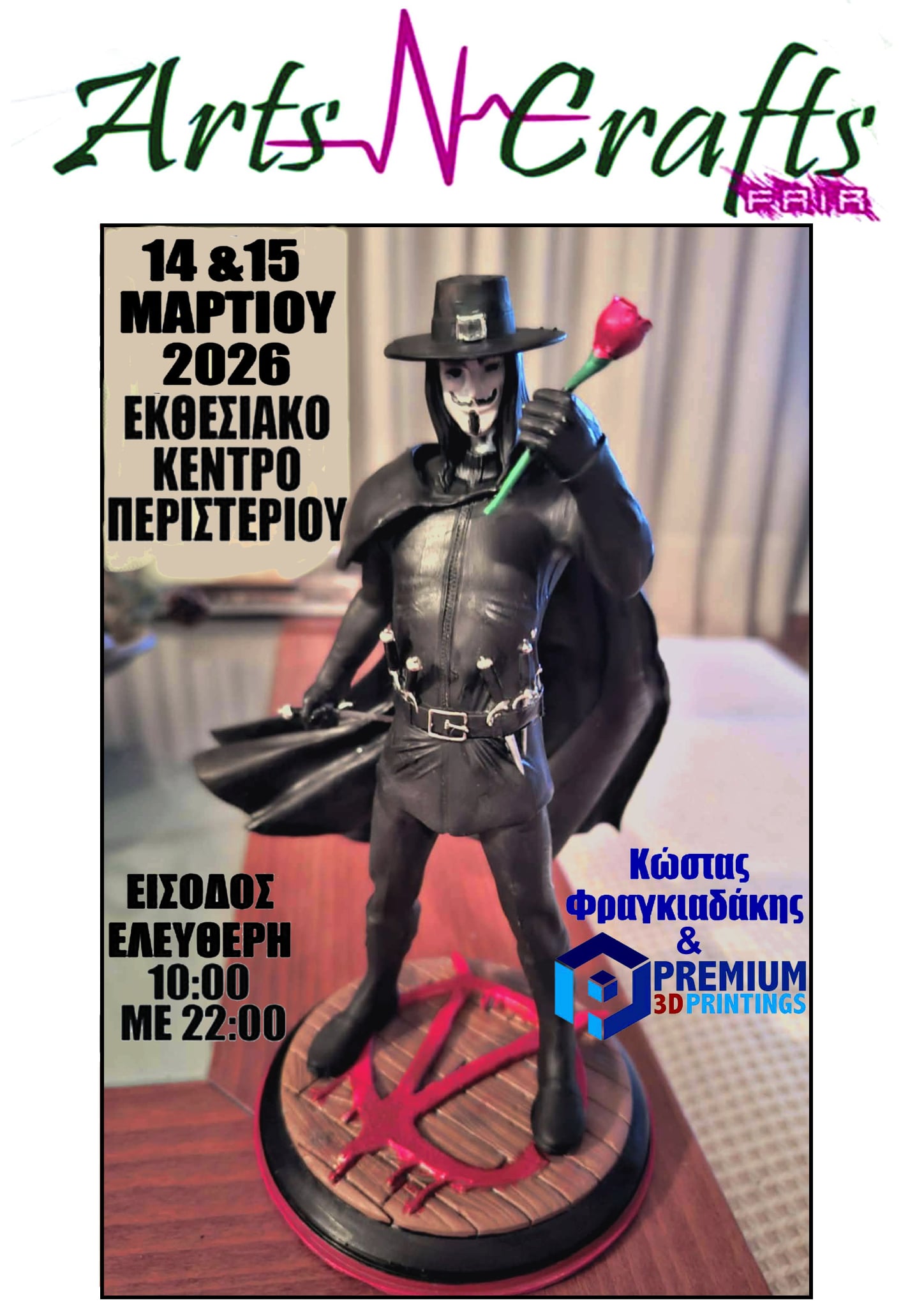Ο εικονογράφος Κώστας Φραγκιαδάκης με τις δημιουργίες του, θα βρίσκεται το Σαββατοκύριακο 14 και 15 Μαρτίου στο Εκθεσιακό Κέντρο Περιστερίου στο 1ο ArtsNCrafts Fair, ένα φεστιβάλ αφιερωμένο στις εικαστικές τέχνες, τις εφαρμοσμένες τέχνες, τις παραστατικές τέχνες και τις λογοτεχνικές τέχνες. Στο τραπέζι του θα βρείτε εκτός άλλων και όλες τις φιγούρες της ομάδας Premium 3d Printings από ρητίνη.
